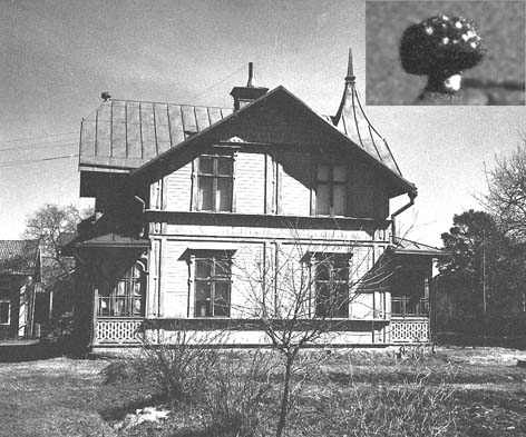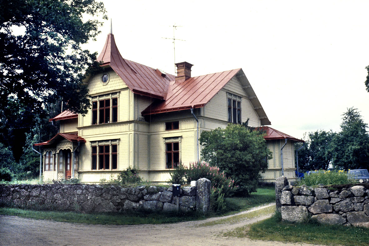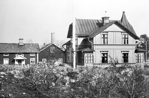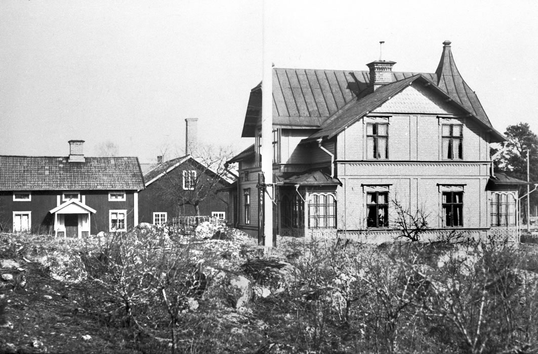 Här är ytterligare en bild från samma tid, tagen från "kullen" där huset står nu. Huset var (och är) målat med linoljefärg. Från vad jag kunnat fastställa var husets ursprungskulörer Engelskt rött, Gul ...... och Grön ..... Så långt det är möjligt har jag använt samma färger idag, såväl kulörer som material. Taket var ursprungligen i målad falsad svartplåt som troligen rostade upp ganska snart. En del vattenskador kom i dagen vid renoveringen som säkert härstammar från den tiden. Ett falsat galvat tak lades på på 60-talet och målades första gången på 1970-talet (Boos bild nedan är från 1979). Jag lät måla om det samtidigt med resten av huset 1998. Tyvärr böt man inte bröstlisterna (även dom i svartplåt) när man renoverade taket, så det blev ett drygt jobb eftersom plåtarna var fastspikan innanför panelen!. Dom ersattes en efter en vid renoveringen. 1984.
