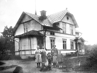 Huset är byggt omkring 1901 i omväxlande stående och liggande massivt timmer, ända upp till nock. Panelering i omväxlande stående och liggande pärlspont. 5 längsgående bröstlister ger fasaden liv. Längst upp under dom generösa takutsprången fiskfjällsliknande panelering. Här en bild av Johan (med 2 pigor?) och Gilbert, Anna, Tage och Astrid. Bilden är tagen på 1920-talet.