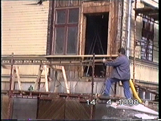 Oisolerad, inglasad någon gång, okänt när. Att det är en efterkonstruktion kan man se på att fönstren (enkelglas) står löst på den välvda och målade överliggaren, och hålls på plats med krökt tretumsspik. Vad man kanske inte kan tro är att träet fortfarande är kärnfriskt! Eftersom det var öppet vädrade väl fukten bort innan den gjorde någon skada. Samma med ytterdörrarna. Jag trodde dom var hopplöst förlorade, men en skicklig snickare räddade dom och alla fönster. Här en bild på verandan från anno dazumal